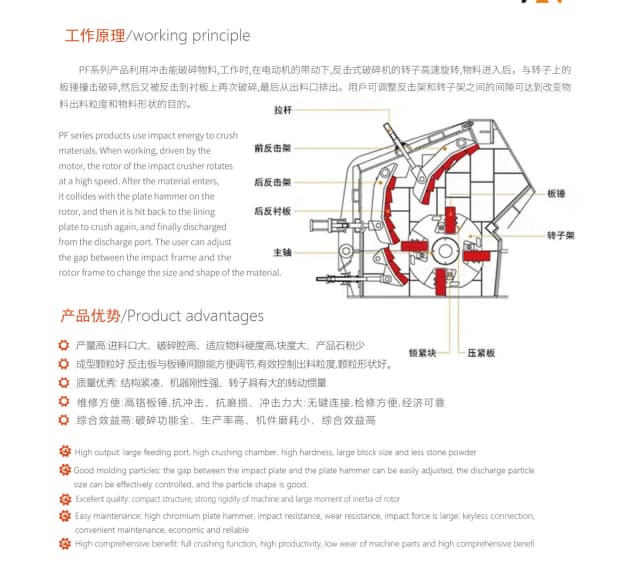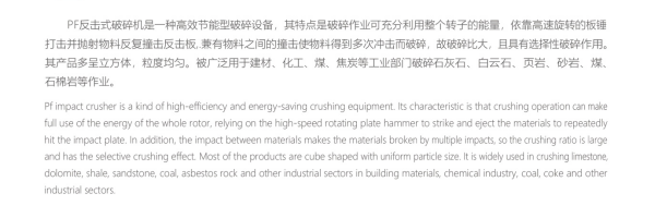 簡介—— PE反擊式破碎機是一種高效節能型破碎設備,其特點是破碎作業可充分利用整個轉子的能量,依靠高速旋轉的板錘打擊并拋射物料反復